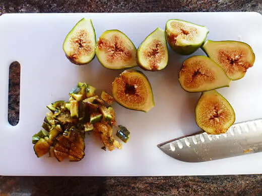 Destem and coarsely chop your figs. The amount of fruit should yield about 6 cups of chopped figs.