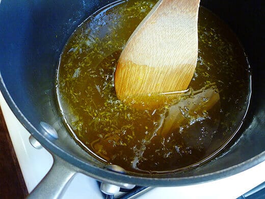 In a large pot, combine the lemon juice, lemon zest, honey, and pectin, and stir well. Don’t use any pot smaller than 4 quarts, because when this thing boils and bubbles up, it really expands!